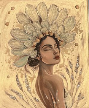 The painting "Silence of the Sun" is a gentle image of femininity, peace and inner light. The canvas depicts a woman with closed eyes, immersed in her own thoughts, in harmony with herself and nature. Her head is decorated with a wreath of large petals and seashells - a symbol of the unity of the elements of earth and sea. The warm golden palette gives the canvas a glow, creating the effect of light emanating from within. The painting is filled with a feeling of peace, tenderness and strength at the same time.